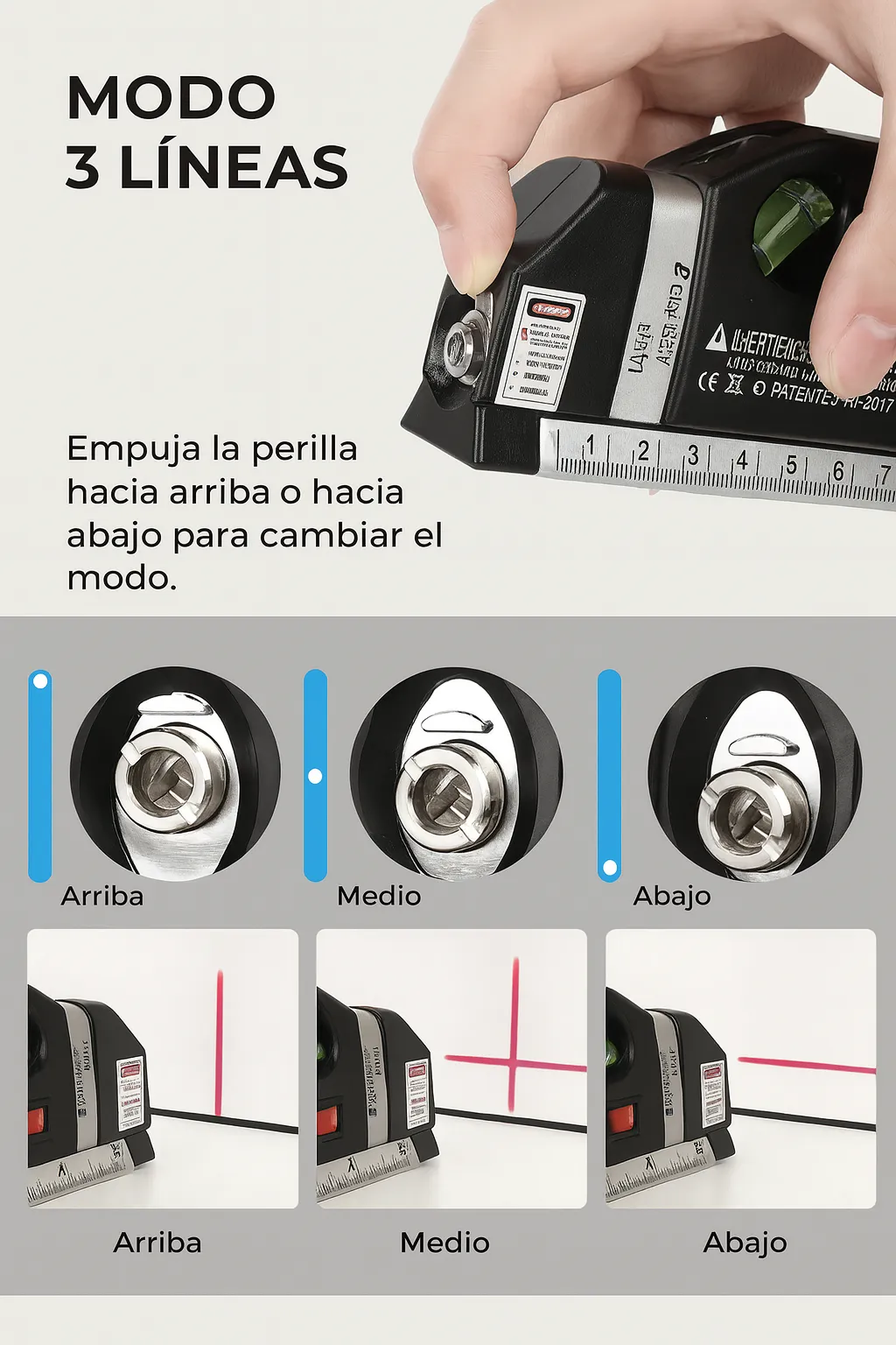 🔴 Láser de 3 modos: línea horizontal, vertical y cruzada.
